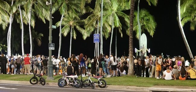 画像は夜の10時から零時頃までのワイキキの状況です。零時を過ぎてもまだまだ宴が続いており、通り寄りからビーチに移動して盛り上がっていました。
