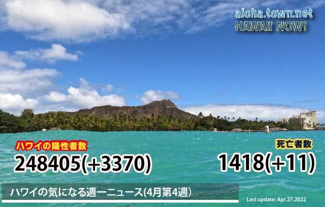 ハワイ州保健省(DOH)は、4月27日水曜日の週次更新で、3,370件の新型コロナウイルスの新規症例と11件の新規死亡を報告しました。これにより、州の合計は248,405件になりました。