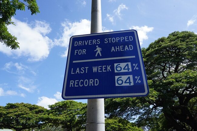 ホノルル市およびホノルル郡運輸局(DTS)は、ドライバーが横断歩道で歩行者のために停止する際の遵守状況を報告することを目的として、オアフ島全域の主要な場所に9つの標識を設置すると発表しました。これらの標識は、重傷を負う事故を防ぐためのオアフ・ビジョン・ ゼロ・プログラムの一環です。