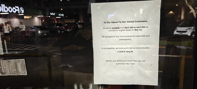 こちらは、リノベーションの為に一時クローズです。タイ料理は、ハワイでは比較的リーズナブルに食べれる貴重な料理で、こちらはいつも賑わっているので、お店が閉まっているのを見た時はビックリしました。改装中はモイリイリにある2号店へ!