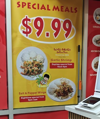 イートインは屋根付きの屋外スペースになりますが可能で、現在オープニング・キャンペーンで9.99ドルで提供しているメニューもあります。(こちらは直接店舗ての注文の場合のみ)