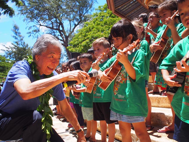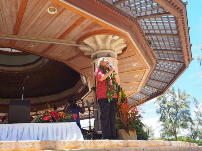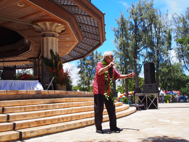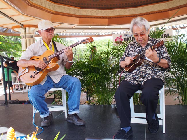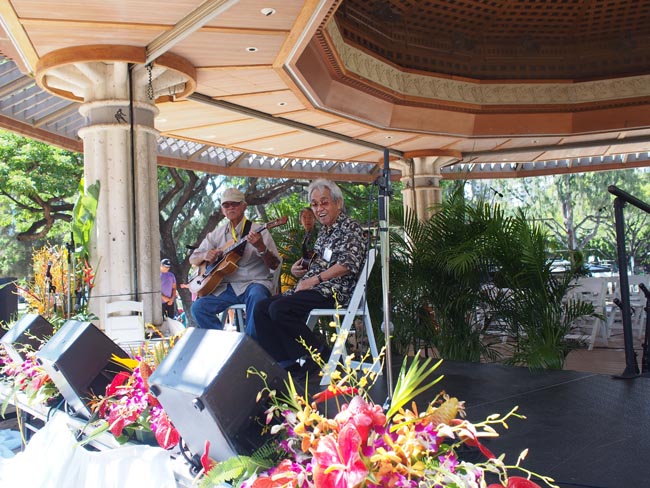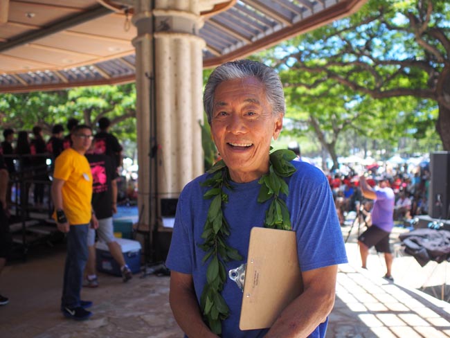 毎年も一万人以上の観客が訪れたこのウクレレイベントでは、ウクレレ界のリビングレジェンドであるオータサンを初め、ウィリー・K、ハーブ・オオタ・ジュニア、ビートレレ・マニア、隻腕のニック・アコスタ、カマカケハウ・フェルナンデス、マノアDNAといった有名ミュージシャンや、カメハメハスクール・パフォーミングアーツアカデミーのウクレレアンサンブル、子どもから大人まで総勢700人のロイ・サクマ・ウクレレバンドなどが演奏しました。毎年司会としてイベントを盛り上げているハワイのアロハ大使ダニー・カレイキニ。今回でなんと46年連続の登場ということです。ダニーさんも超の付くほど元気に飛び回ってました。