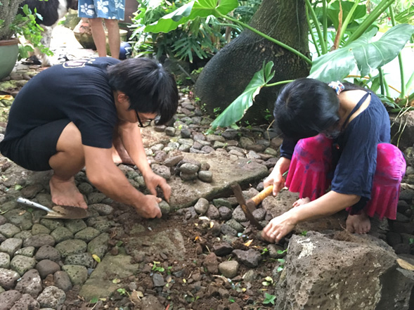 裸足でしゃがんだ状態で道場前の石畳を直す作業をする志統館メンバー。この体勢で一日中仕事しても体は痛まない。