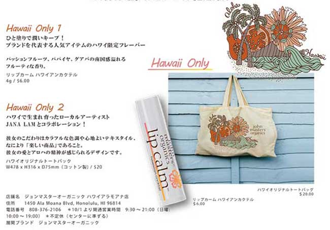 ニューヨーク生まれのオーガニック・コスメティック・ブランドの『ジョンマスターオーガニック』のハワイ1号店がアラモアナセンターに10月1日オープンいたします。ハワイ限定の商品や、限定アーティストとのコラボアイテムも登場いたします。日本でも人気のオーガニックブランドの直営店がついにハワイ上陸です!