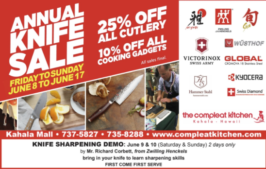 ハワイの有名レストランのシェフも足繁く通う、カハラモールのキッチン用品専門店「ザ・コンプリート・キッチン」にて、年に1度のビッグナイフセールが6月8日(金)から17日(日)に開催されます! “ヘンケルス“ や “ツヴィリング” などのドイツブランドから、スイスアーミーで知られる “ビクトリノックス” 、そして日本が世界に誇る ”グローバル”、“旬” をはじめ “京セラ” のセラミックナイフまで、あらゆる用途に対応するナイフ類が全て25%オフに。また、最新式のナイフシャープナーや砥石、オアフ島の形のオリジナルまな板など、ナイフ関連商品も25%オフのお得な価格で購入できます。新商品として最近登場した、ザ・コンプリート・キッチンとアメリカのキッチン用品ブランド “ハンマースタール” がコラボしたロゴ入りオリジナルナイフは、自分用にもお土産にもぴったりです。