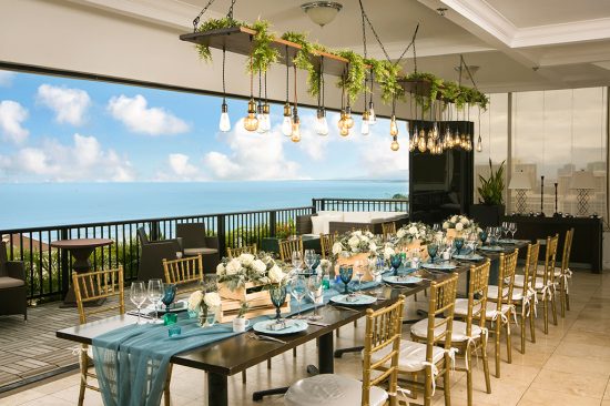 ワイキキの中心地に佇むインペリアルホテル最上階のペントハウス「オーシャン・スイート・ワイキキ」を貸し切って行われるクチュールナオコ ウエディングの「D&D スペシャルコラボレーションパーティープラン」では、2色(ダスティブルーまたはダスティローズ)のテーマカラーのどちらかのカラーに合わせたテーブルセッティングやデコレーションが施される。DEAN & DELUCA HAWAIIがパーティーフェイバーやテーブルデコレーション用の小物の一部、ギフトなどに日本未発売のDEAN & DELUCA HAWAIIアイテムを提供、BRIDAL FLOWERS HAWAIIが装花やブーケを担当して、今までにないおしゃれで洗練されたプライベートパーティーを演出する。