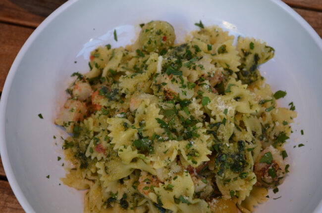 • マカダミアナッツペストのボウタイパスタ – 海老のガーリックバター&バジルソースとトマトのコンフィ