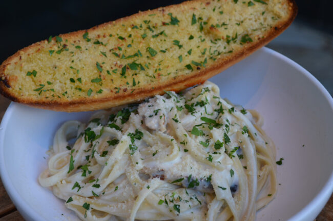 • フェットチーネ・アルフレド – グリルしたチキンに黒胡椒の効いたクリームソース
