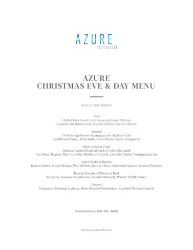ロイヤルハワイアンラグジュアリーコレクションリゾートでは、12月24日(日)と25日(月)の午後5時30分から午後9時まで、クリスマス特別コースディナーをリゾートのシグネチャーレストラン、アズーアレストランで提供しています。また、モナーク・ルームでは12月25日(月)の午前10時から午後1時まで、クリスマス限定のブランチビュッフェを開催します。