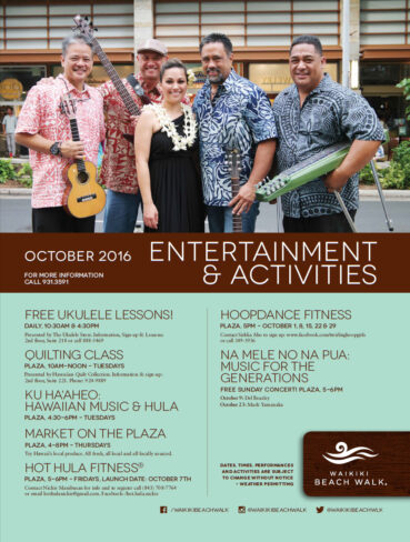 KAIWAのあるワイキキビーチウォークには、1階に噴水広場があり、様々なイベントが行われています!ウクレレ教室、ヨガ、フラダンス、フラフープフィットネス、キルティングクラス、フリーコンサート、などなど。10月7日(金)には、「ホット・フラ・フィットネス」も開催されます。