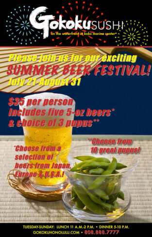 夏のビール祭りでは、ビール(5oz)が5杯と、ププ3種類がセットで$35で提供されます。ビールは日本産、ヨーロッパ産、アメリカ産から選べ、ビールが進む美味しいププも、豊富に10種類の中からチョイスできます。