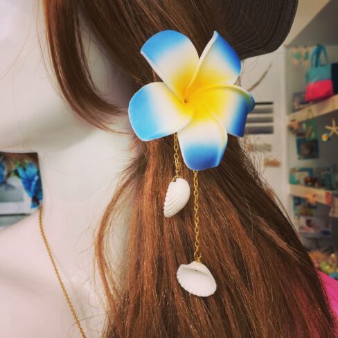 定番の髪飾りは、シェルのチャームをつけて他の人とかぶらないデザインはいかがでしょうか。