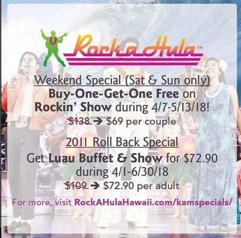 また、新しくなったラインナップを記念して、ロック・ア・フラではハワイ在住者限定の特別キャンペーンも実施中です。4月7日から5月13日までの間、土日限定でショーのみの「ロッキンショー」チケット(小売価格$69)が、一枚購入するともう一枚無料となります。チケットご購入時、有効なハワイ州IDをご提示ください。