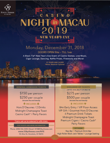 ハワイの地元紙ホノルルスターアドバタイザー主催の投票や、日本人が中心となってハワイのベストを選ぶ『111 ハワイアワード』のベストビューレストラン部門で1位に選ばれたカカアコの名店『フィフティスリー バイ・ザ・シー』では、今年も大晦日の夜にゴージャスなニューイヤーズイブ・イベントを開催します。2018年12月31日 (月) 午後9時に開場し、年が明けた午前1時まで続きます。