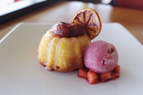 オリーブオイルケーキのサングリアシャーベット添え