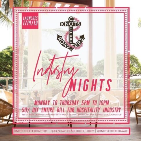 新しく生まれ変わったクイーンカピオラニホテルのロビーに位置する「ノッツ コーヒーロースターズ(以下ノッツ)は、オープンなスペースに座り心地の良い椅子が並ぶおしゃれなカフェバー。朝のコーヒーや愛犬とのティータイム、ハッピーアワーのメニューなどが人気のノッツでは、このほどホスピタリティ業界で働く顧客のために「インダストリーナイツ」をスタートしました。