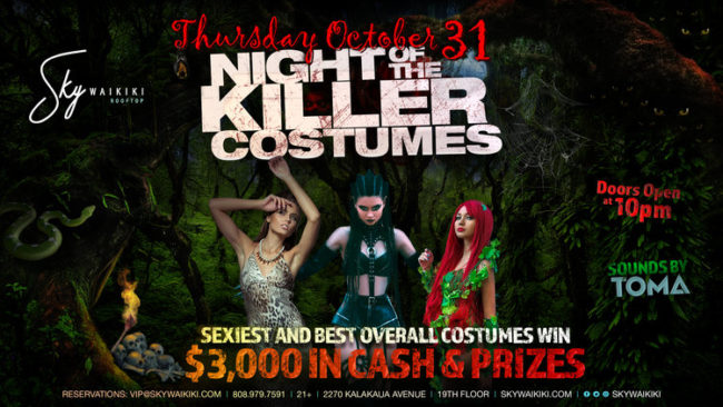 ワイキキで一番眺めの良いルーフトップレストラン、ラウンジ、ナイトクラブとして知られる 「スカイワイキキ」では、2019年10月31日(木)の午後10時から、毎年恒例のハロウィンパーティー「Night of the Killer Costumes」を開催します。