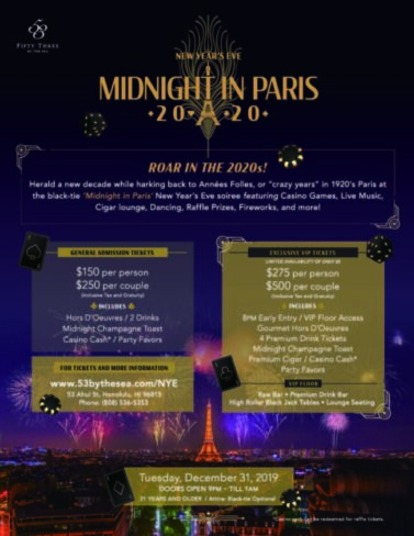 毎年参加を楽しみにしている常連も多いこのニューイヤーズイブ・パーティー、今年のテーマは『ミッドナイト・イン・パリ』。同名の映画のように1920年代のパリにタイムスリップし、魔法にかかったような非日常の世界を満喫できる。パーティーは2019年12月31日(火)午後9時に開場し、翌午前1時まで続く。当日メインダイニングルームではブラックジャック、ルーレットなどの模擬カジノ、アイランドキングスバンドによるライブミュージック、ダンス、シガーラウンジ、ラッフル抽選会が行われ、深夜にはシャンパンで乾杯しながら東西2カ所で上がる年越し花火の鑑賞など、華やかな大人の遊びが用意される。パーティーチケットは以下の2種類から選べる。