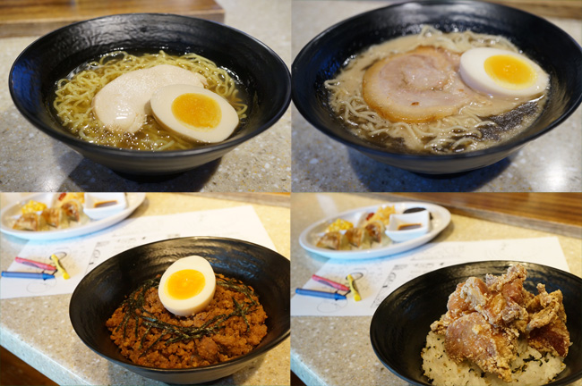 ラーメンは、鶏ガラまたは豚骨スープの醤油味または塩味の計4種類で、いずれもチャーシュー1枚と半熟たまご半個が付きます。ラーメンの代わりに、白ごはんに甘辛生姜醤油味の鶏挽き肉をのせたそぼろ丼、またはふりかけごはんにカラッと揚げた鶏肉をのせた唐揚げ丼を選んでいただくこともできます。どのセットも、ポーク餃子3つ、スモールサイズのコーン、フライドポテト、そしてオレオクッキー1袋(2個入)が含まれます。また、お子さまが待っている間退屈されないよう、ぬり絵や言葉さがしパズルの印刷された専用のメニューをクレヨンとともにご用意しました。