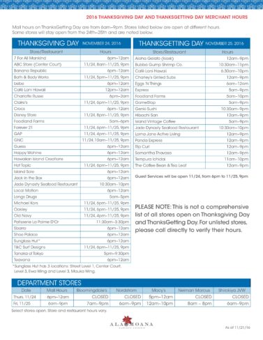 11/24(木)感謝祭当日もアラモアナセンターの一部店舗が営業