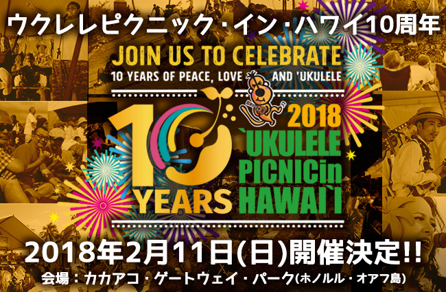 まるでピクニックのように屋外のリラックスした雰囲気の中、ハワイ発祥の楽器であるウクレレを楽しみたい、そしてより多くの人にウクレレに親しんでもらいたいと始まったウクレレピクニック・イン・ハワイが、来年10周年を迎えます。前日には、インターナショナル・ウクレレコンテスト&フラショーも開催されます。