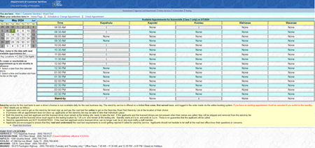 以下にアクセス。(https://www12.honolulu.gov/csdarts/default.aspx)→ 「Schedule or Change Appointment」を選択 → 「カレンダー」で空き状況を確認 → 希望の「時間」を選択(右の予約表に数字が入っている所は予約が可能です。前の日になると空きが出てくる場合があります。) → 「Login Form」に入力(仮免の番号が必要) → 「Submit」を選択 → 「予約の変更」画面になり変更を希望すると予約の日程が変更になります(詳細データが入力したメールアドレスの送られてきます。この予約フォームを印刷して試験当日に持参しなければいけません。)