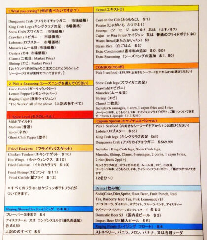 単品メニューも色々ありますが、やはりコンボがお得!コンボはズワイガニの足、ザリガニ、ムール貝、エビ、2枚回の中から好きなシーフードを3種類選べます。さらにソーセージ6切れ、トウモロコシ1本、フライドポテト、ご飯がついてきて$39.99。量は2人だと十分すぎるほど満足できる量なので、とてもお得です。ちなみにメニューは日本語のものがありますし、たまに日本語ができる店員さんもいるので安心です♪