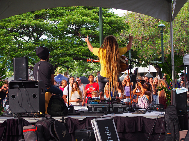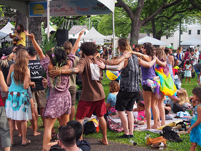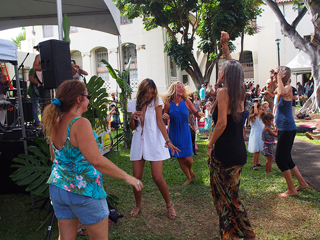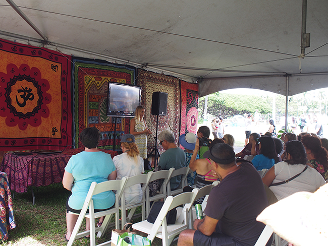 来て一番に気が付いたのですが、普段のイベントとは明らかに客層が違っていました。まず、ハワイにもこんなに白人がいたんだ!と思うくらい白人率が高かったです。サモア系のローカルの人はほぼいませんでした。アジア系も少なかったです。そしてとにかく皆さん、体が筋肉質。特に女性がそうです。さらに多くの人が、大きくTATOO入れてます。この会場は、ロス?と勘違いするくらい、ハワイらしくありませんでした。でもすごくピースフルな雰囲気が漂っていてイイ感じでした。来てる人は皆健康的でした。