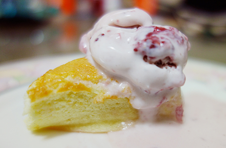 2. 温まったケーキにお好みのアイスをON~♪(私はハー〇ンダッツのストロベリー♪)