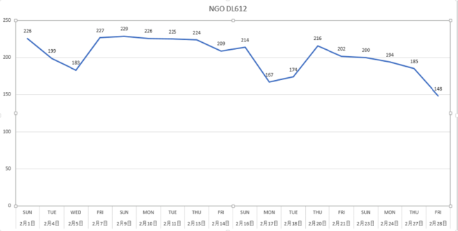 それぞれのフライトの2月の搭乗者数は下記の通りです。
